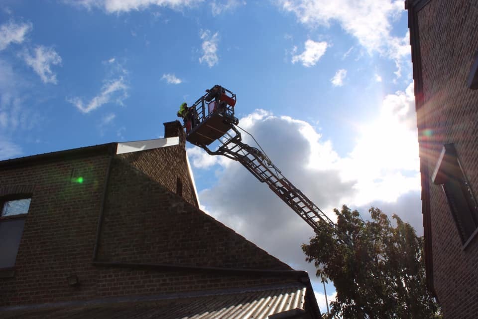 Uiteraard gingen we vanmorgen weer ter plaatsen. We vroegen Brandweer Tongeren om hun bijstand met de ladderwagen.