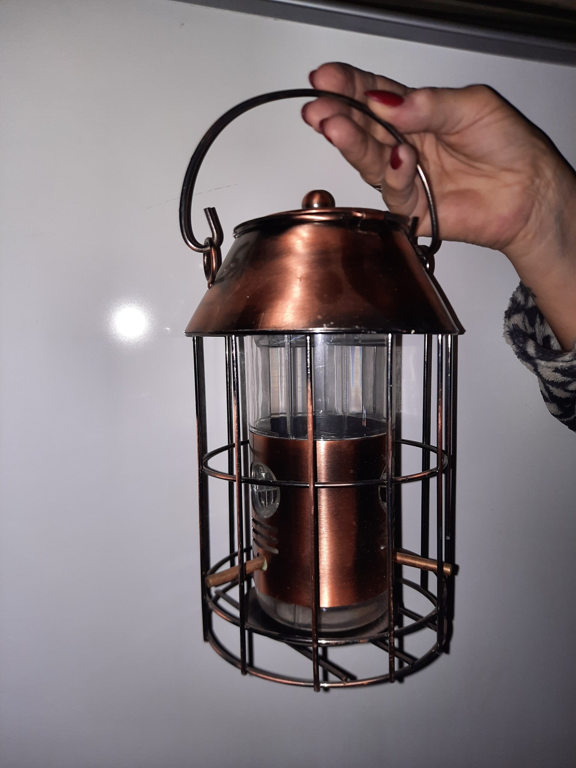 Prachtige design voedersilo's in roestvrijstaal met koper kleur. Met een bescherming rond tegen grotere vogels.
