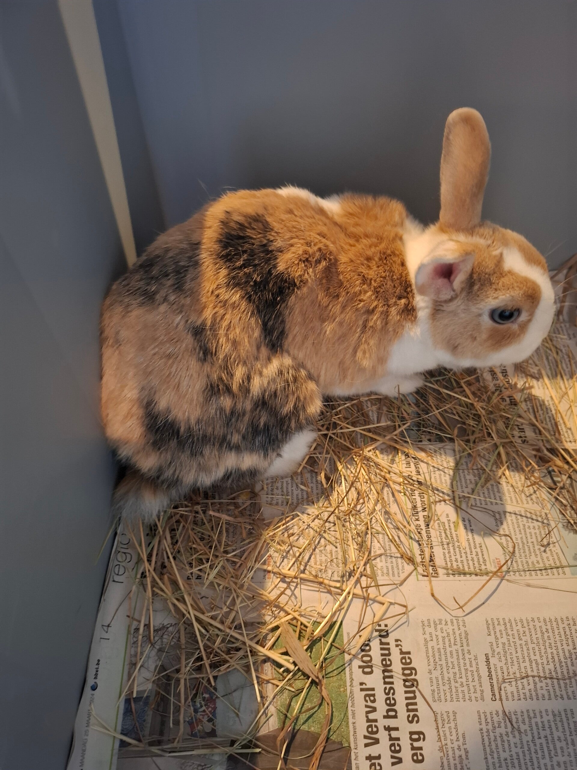 Ik ben Marie, een tricolor dwergkonijntje van ongeveer 4 jaar. Ik heb al een grote operatie achter de rug aan een tandabces, maar die is succesvol weggehaald door de dierenarts. Dat hoofdstuk ligt achter me en ik voel me klaar voor rust en warmte.